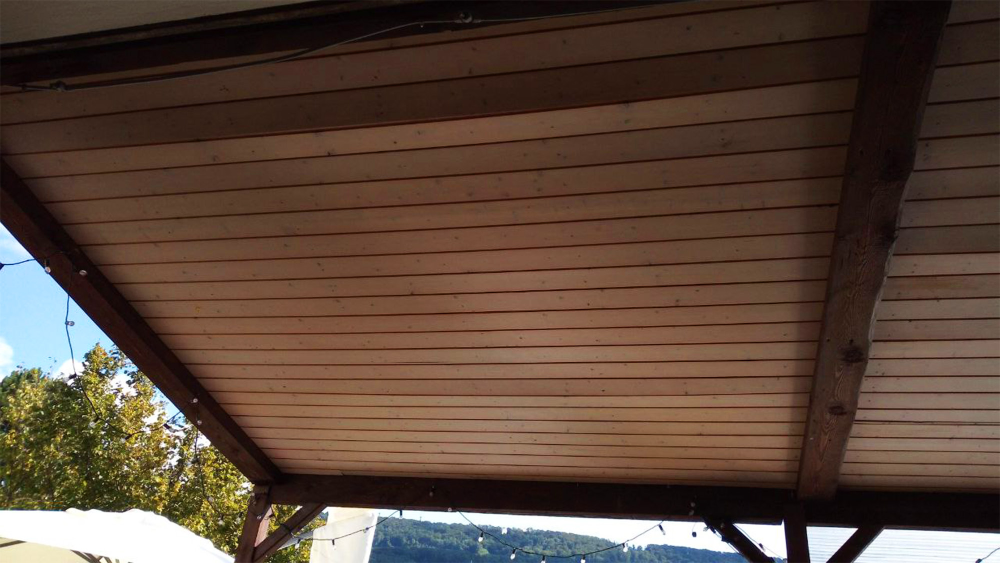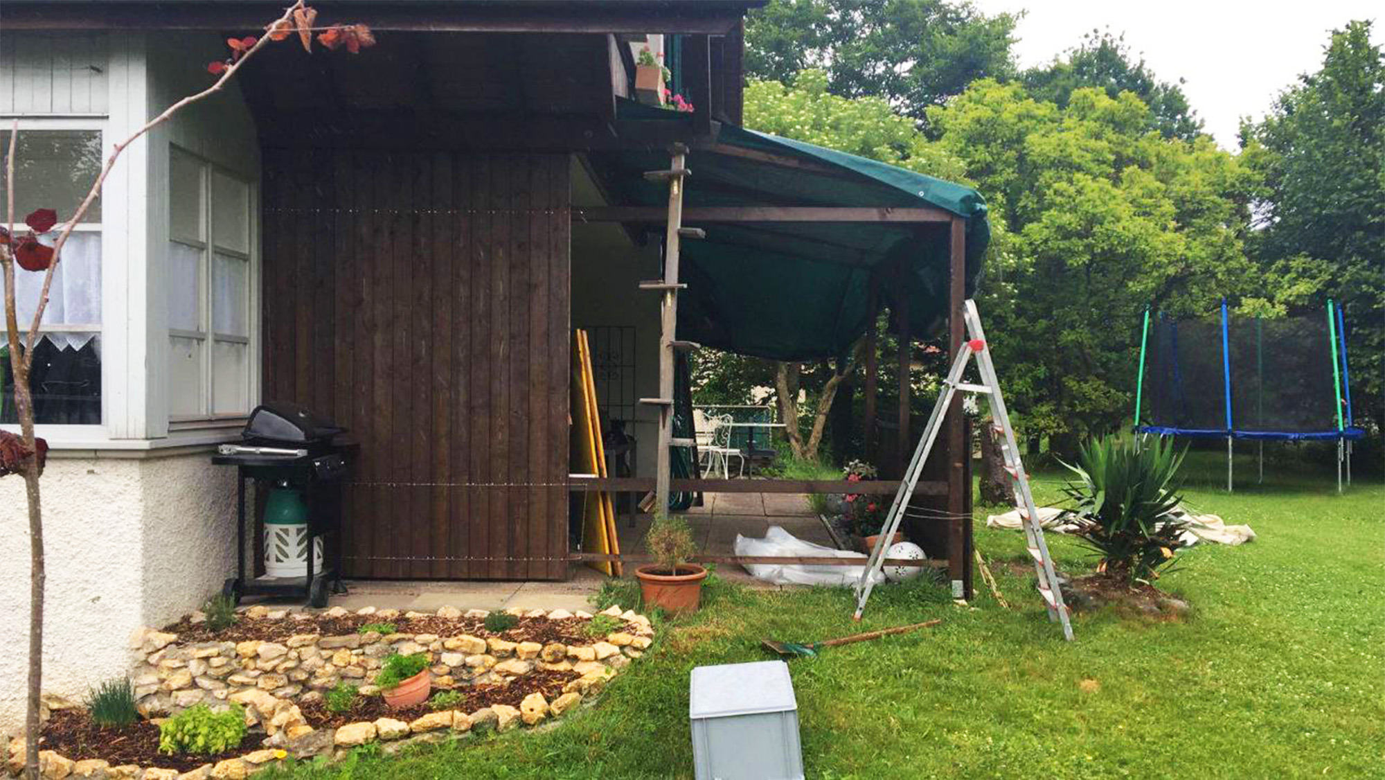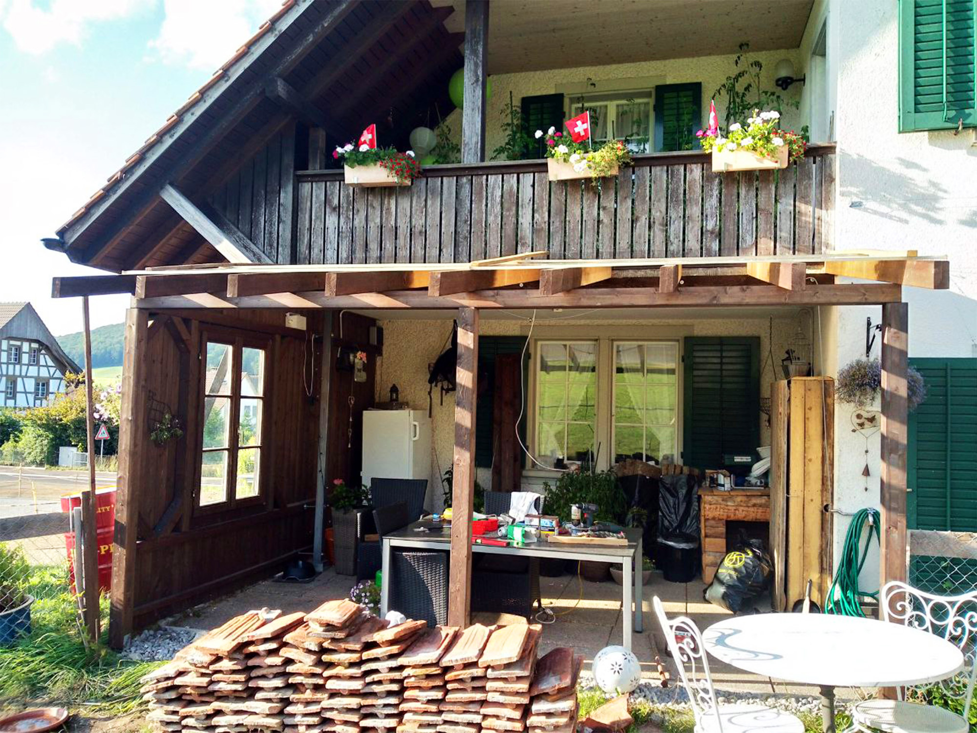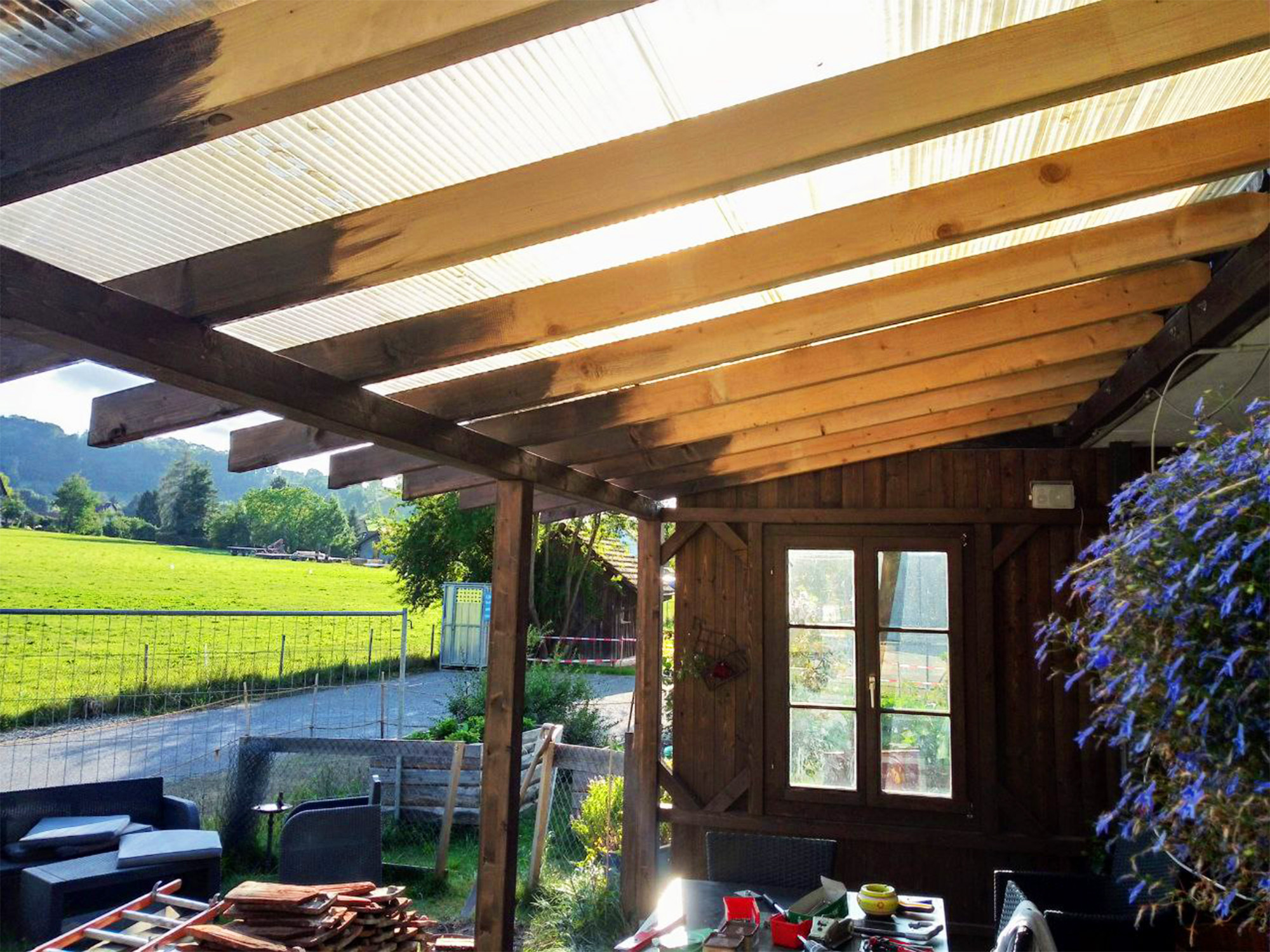 Damit der Sitzplatz auch bei Schlechtwetter genutzt werden kann, wurde dieser kurzerhand eingefasst, überdacht und heimelig gemacht